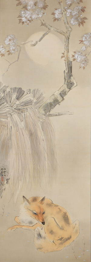 満開の山桜を照らす朧月。その樹の傍らには一匹の狐が描かれている。月の輪郭と桜の花びらに金泥を用い、胡粉を左方に寄せ叩くことで月光の射す方向を示唆し、月と桜の間に存在する空間を作り出している。落ちた花びらは銀泥で描き出され、傍らの土筆と共に春が暮れゆく事を告げている。