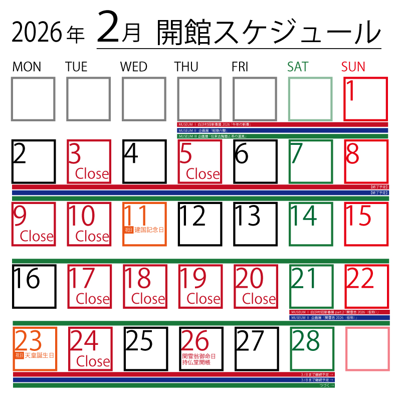・2/5、2/18~20は設備調査と照明設備の変更工事が予定されています。工事完了後は1Fの展示がさらに美しく、見やすくなる予定なのでご期待ください。